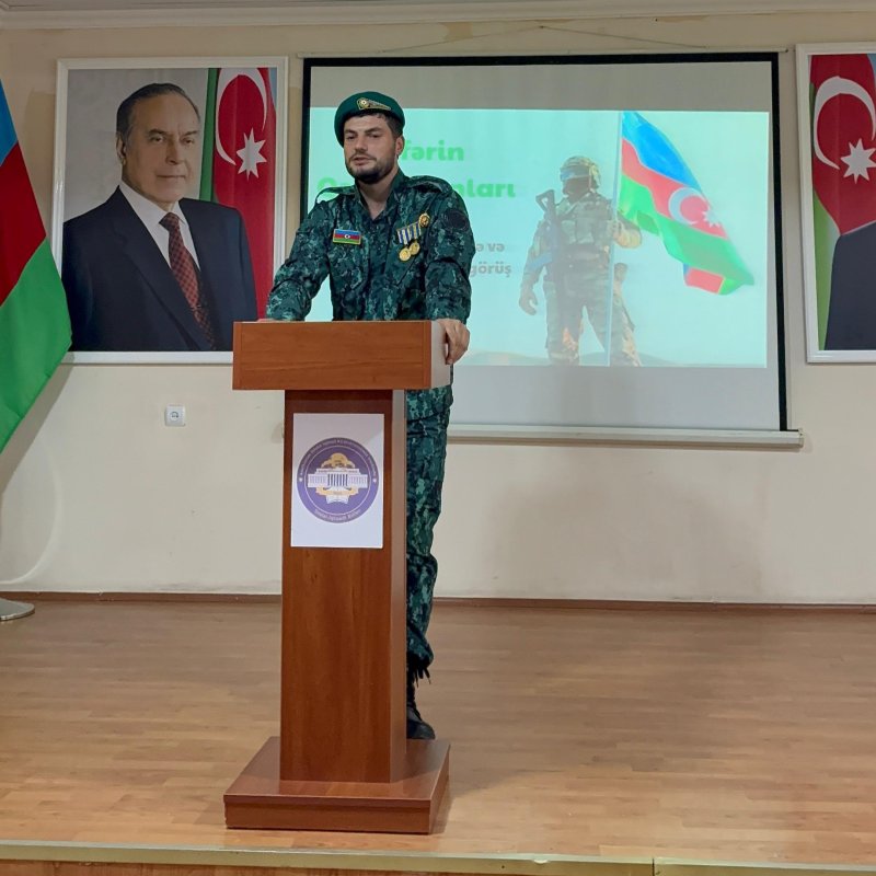 2025-ci il 8 noyabr - Zəfər Gününün beşinci ildönümü ilə əlaqədar Tədbirlər Planına uyğun olaraq UNEC-in nəzdində Sosial-İqtisadi Kollecdə 44 günlük Vətən müharibəsi iştirakçıları Əlizamin Talıbzadə və Fəqan Hüseynovla görüş keçirildi.