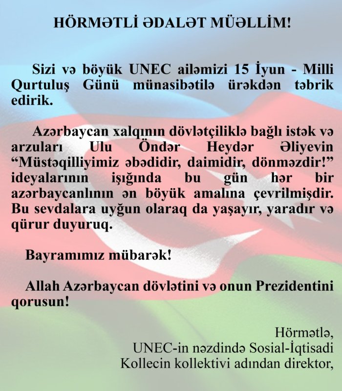 15 iyun - Milli Qurtuluş Günü münasibətilə təbrik